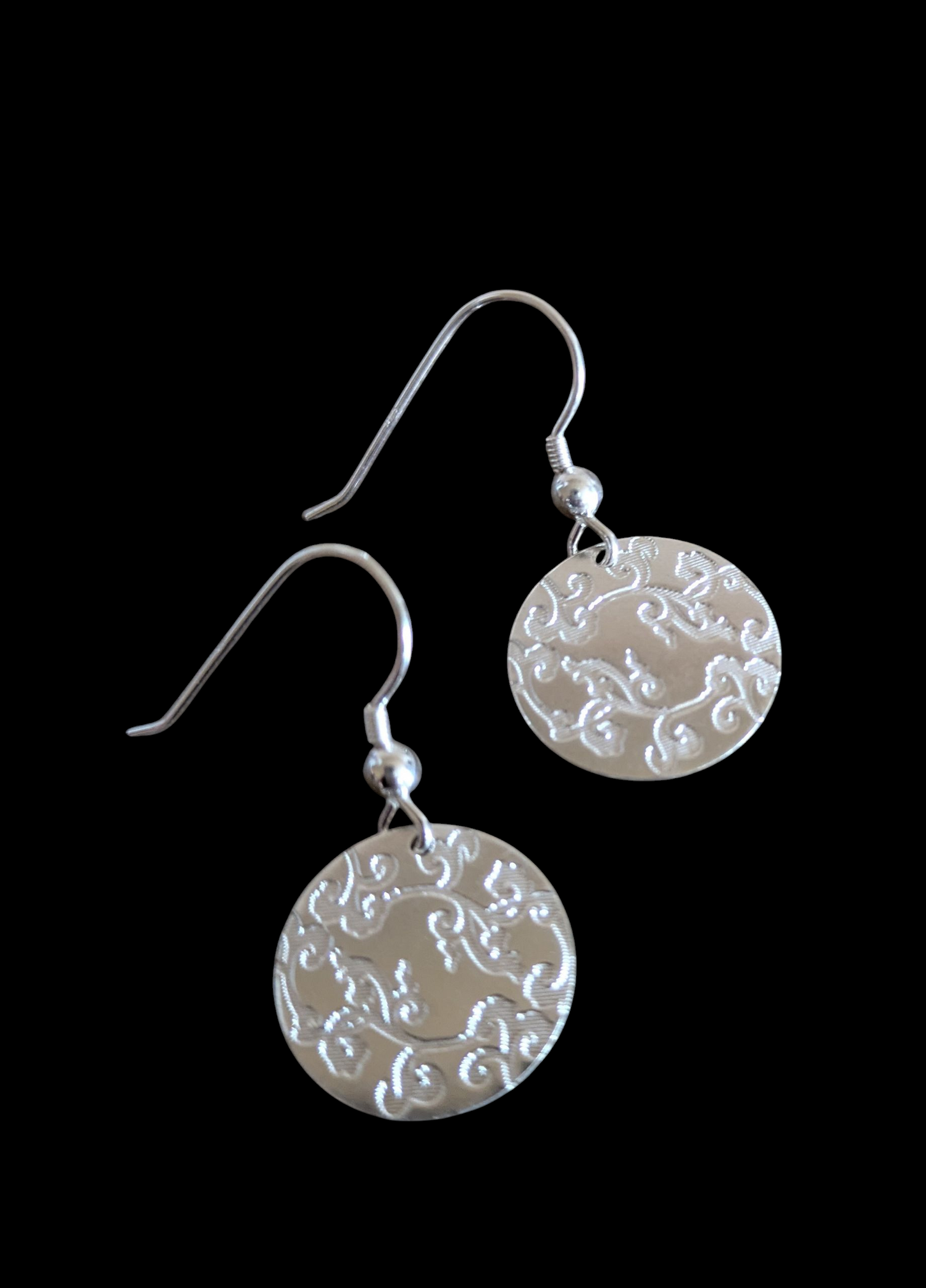 These simple sterling silver circles are elevated by the delicate vine imprints (on both sides of the circle.)