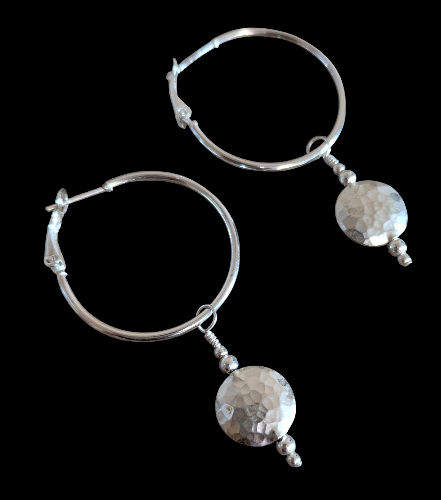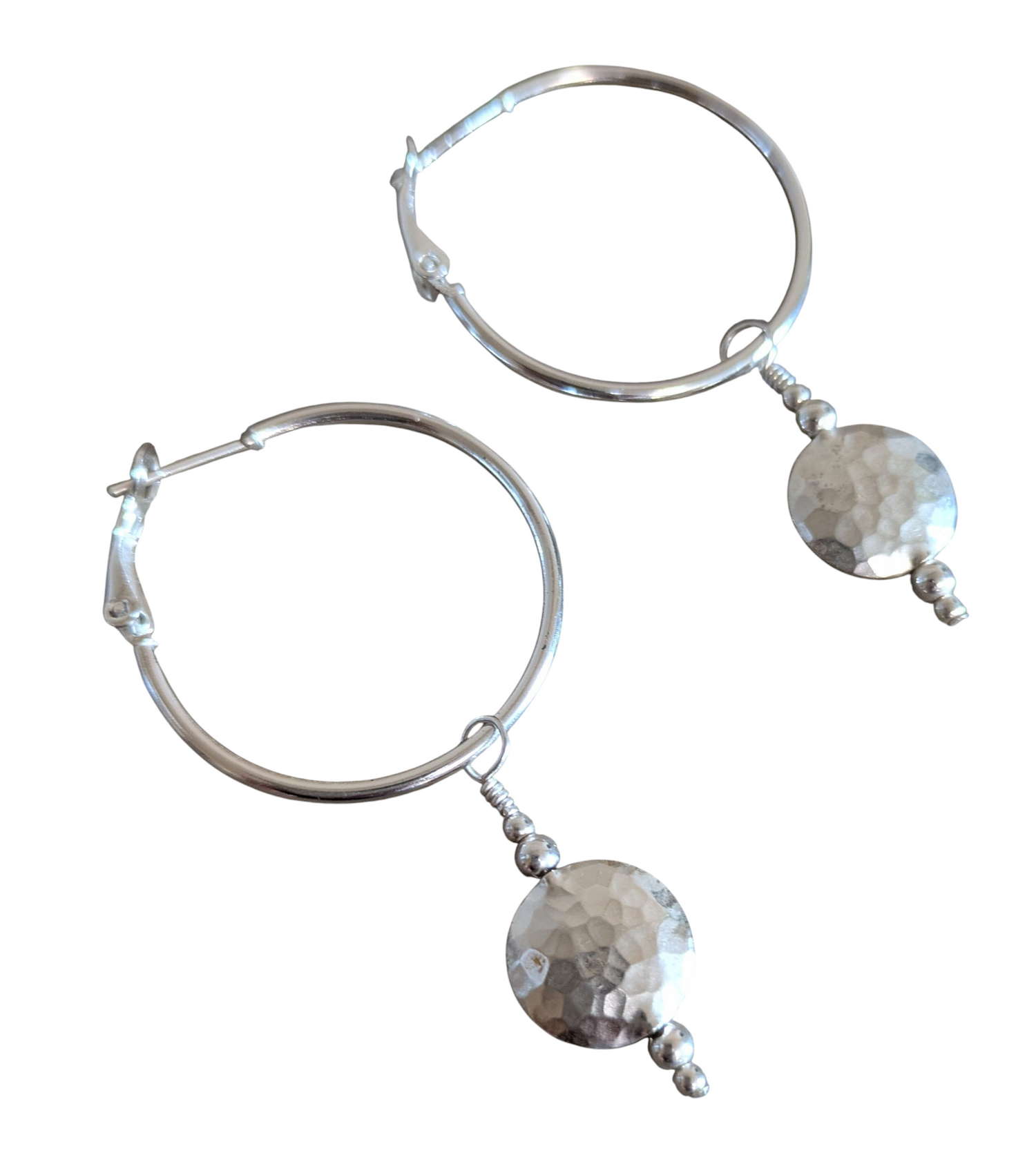 The sterling silver hoop earrings are 30mm in size. They are adorned with hammered circle charms that can be removed.