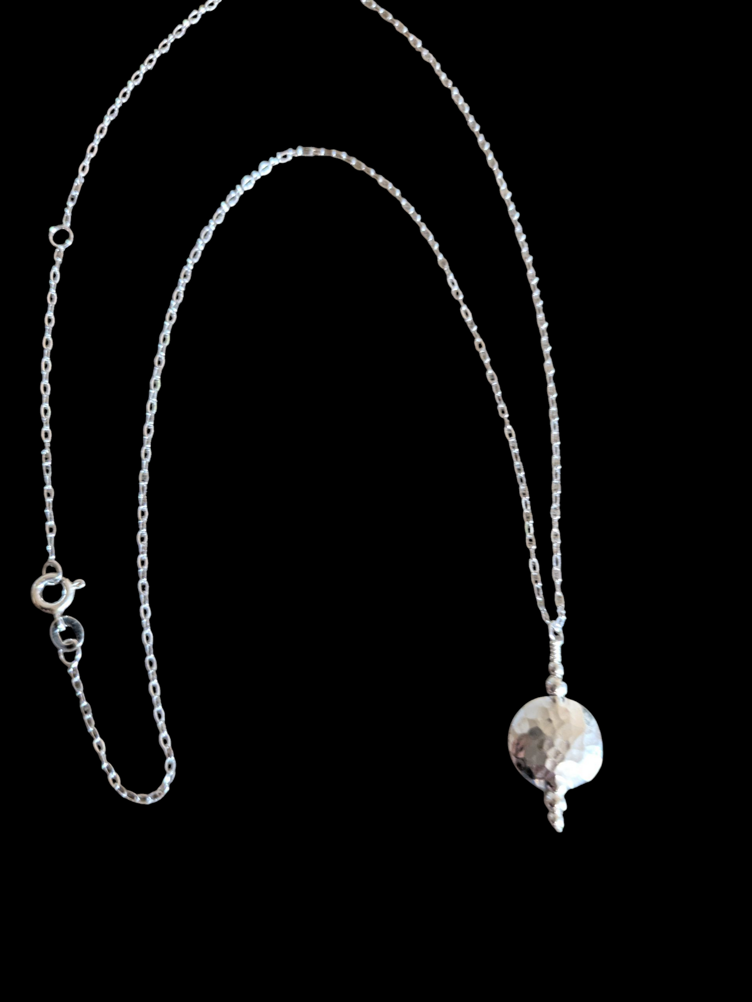 This necklace is perfect for every day wear. The sterling silver circle is hammered on both sides giving it an amazing texture that "ups" your look. The chain is out signature dainty chain and comes in 16/18" or 18/20" length.