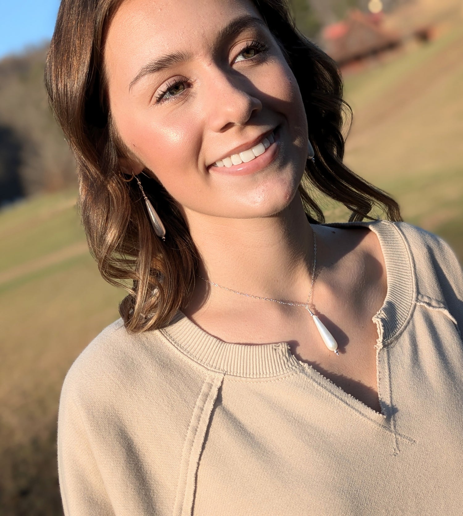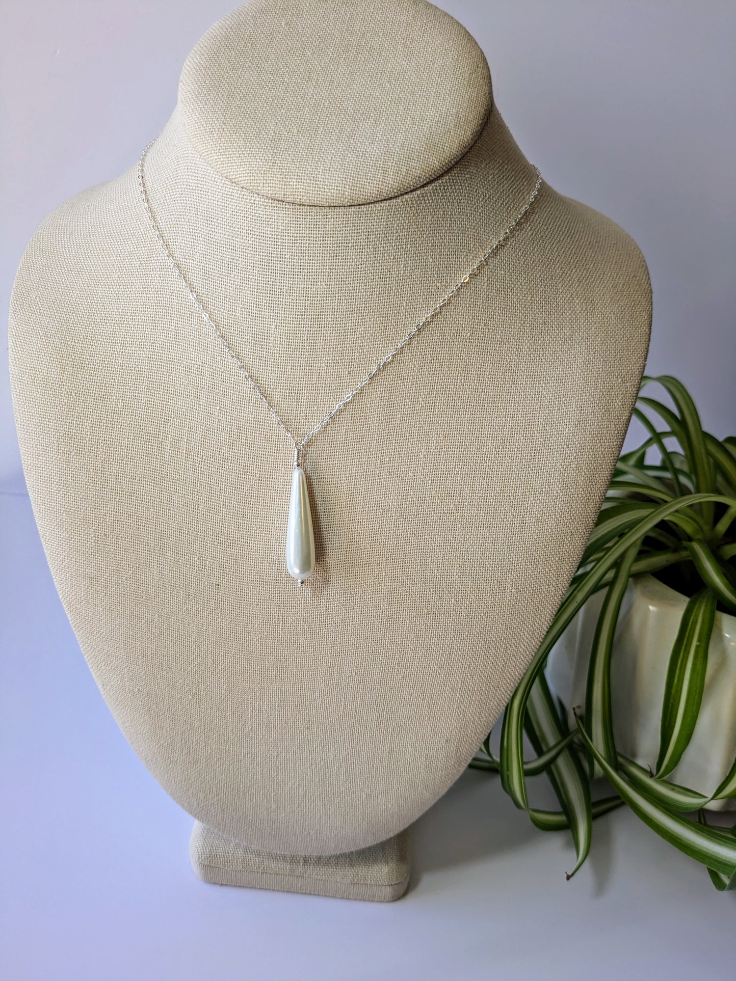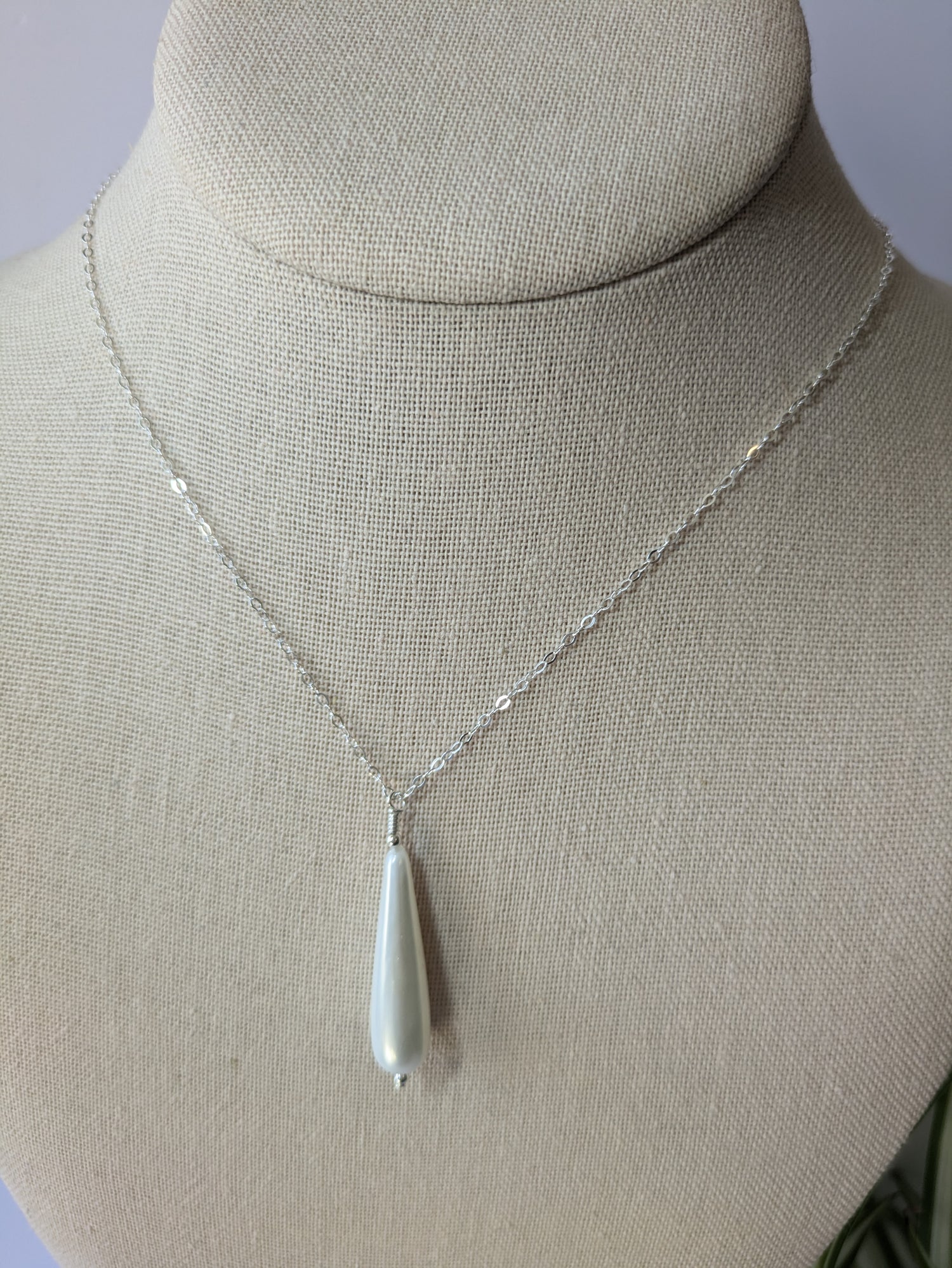 The teardrop shaped pendant is made of shell pearl on a sterling silver chain. The chain comes in your choice of length - 16/18" or 18/20".